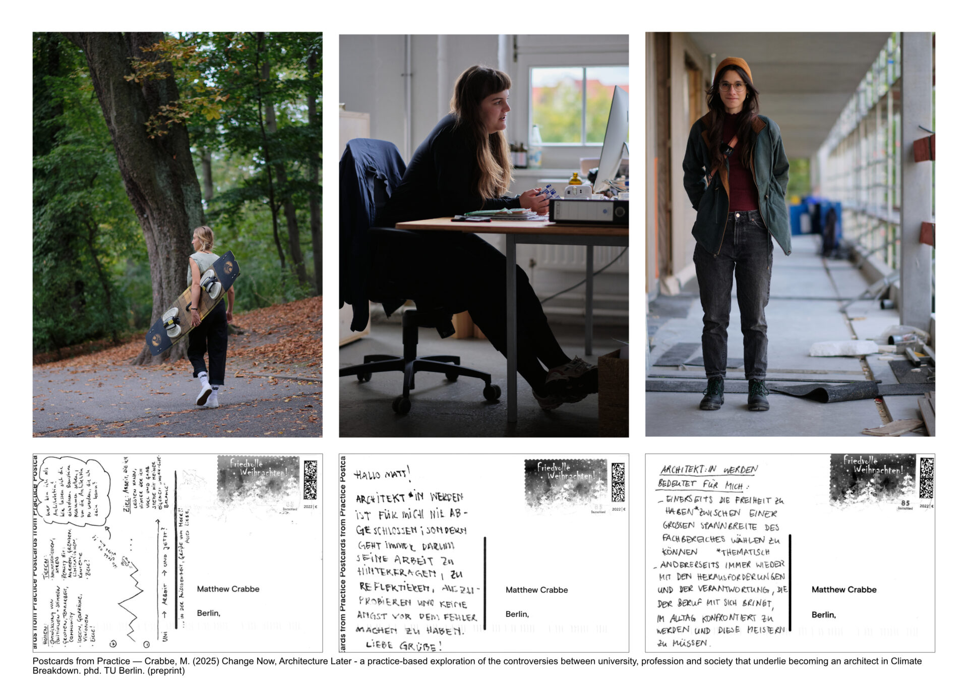 The longitudinal study focuses on nine architecture graduates, two to five years after graduating from the Technische Universität Berlin. This group comprises diverse perspectives, including a civil servant, a journalist, graduates working in architecture offices, a collective, and two start-ups. The practice-based research design oscillates between “Chapters” providing context, methods and theory, and “Tasks” which deploy diverse methods such as interviews, portrait photography and narrative inquiry, often thematising the tacit knowledge and assumptions of researcher, participants and reader. These methods show how graduates perceive architecture as part of a dynamic professional “self-understanding” reflecting their life politics and career ambitions. Exploring the practice gap reveals a series of controversies surrounding climate, societal role, labour issues and generational attitudes to work that lead the graduates to question their motivation to practice architecture. For some of the interviewees, transcending these challenges has resulted in them pursuing careers outside conventional architecture practice.